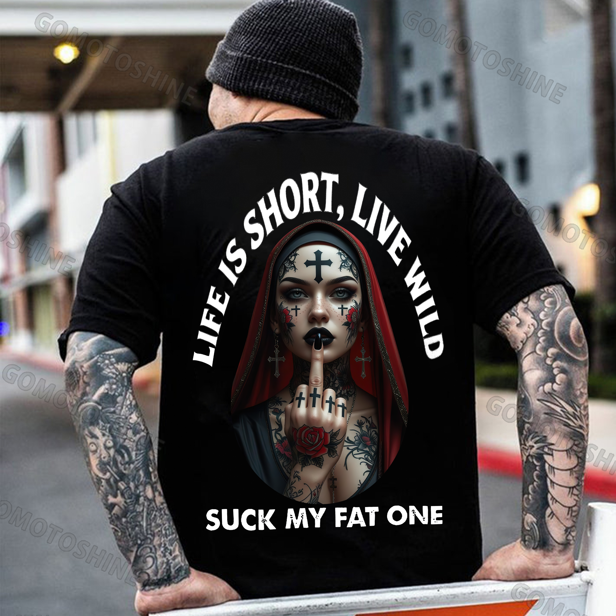 LIFE IS SHORT LIVE WILD SUCK MY FAT ONE Defiant Nun Print Men's T-shirt