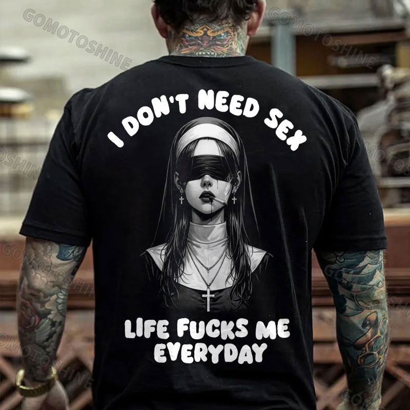 I DON'T NEED S*X LIFE FUCKS ME EVERYDAY Blindfolded Smoking Nun Print Men's T-shirt