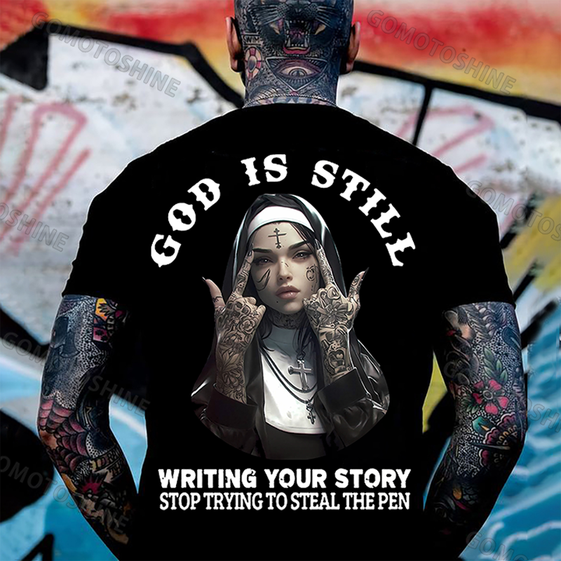 GOD IS STILL WRITING YOUR STORY STOP TRYING TO STEAL THE PEN Defiant Nun Print Men's T-shirt