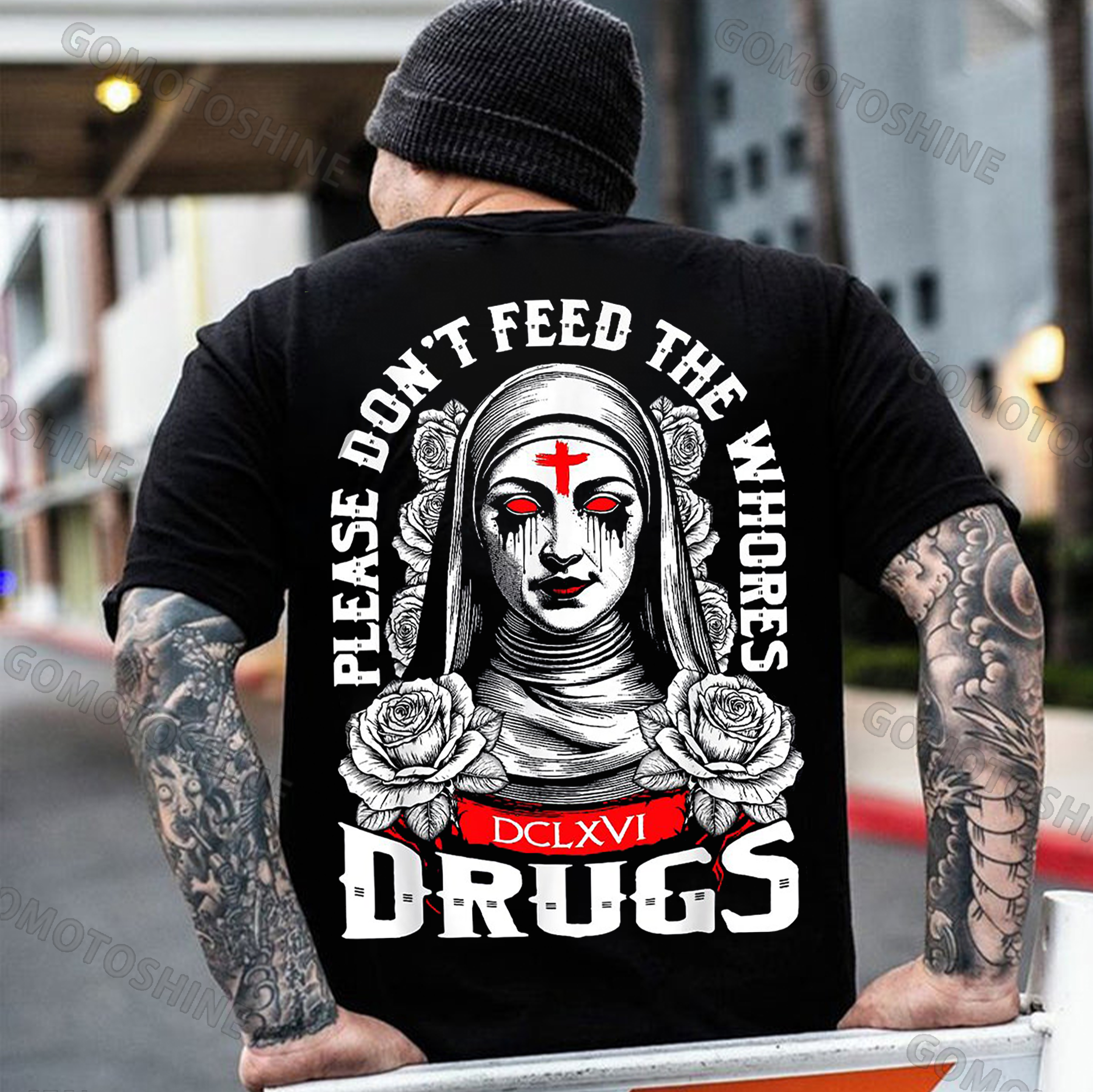 PLEASE DON'T FEED THE WHORES DCLXVI DRUGS Evil Ghost Nun Print Men's T-shirt