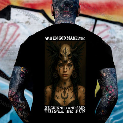 WHEN GOD MADE ME HE GRINNED AND SAID THIS'LL BE FUN Goat Skull Tribal Girl Print Men's T-shirt Image - 1